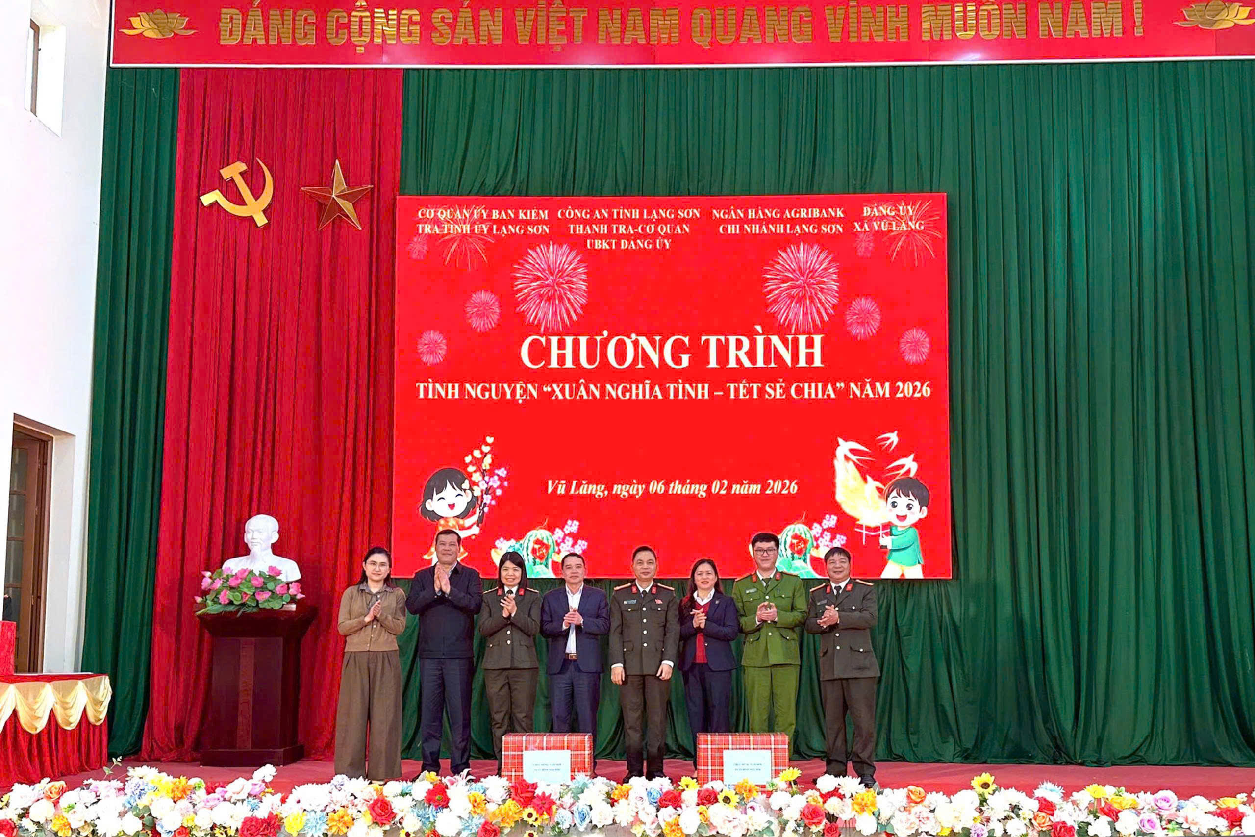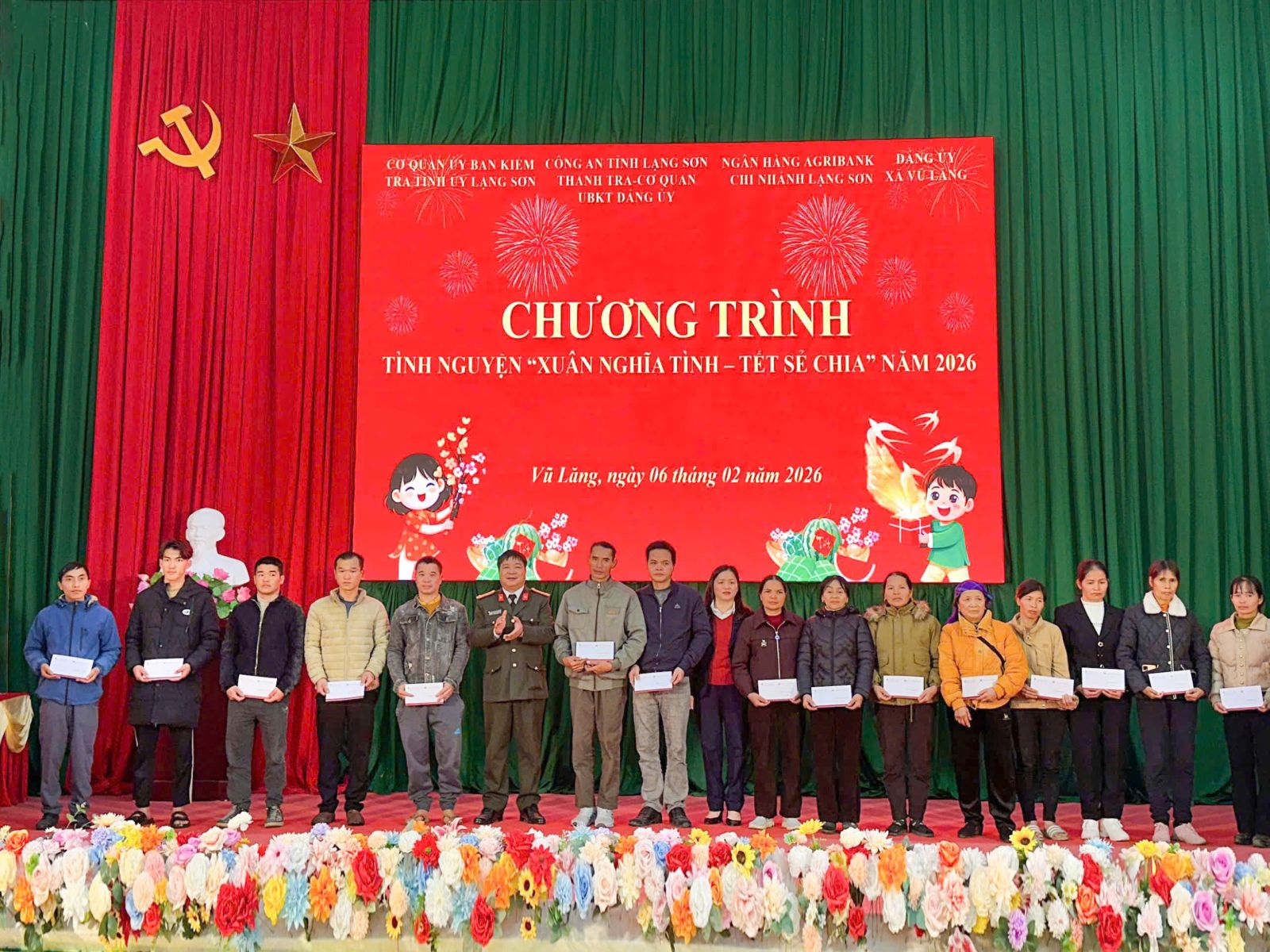 Ngày 06/02/2026, Cơ quan UBKT tỉnh ủy, Công an tỉnh Lạng Sơn phối hợp với Ngân hàng Agribank Chi nhánh Lạng Sơn tổ chức Chương trình tình nguyện “Xuân nghĩa tình - Tết sẻ chia” trao quà cho các hộ có hoàn cảnh khó khăn, gia đình có công, gia đình chính sách trên địa bàn xã Vũ Lăng nhân dịp Tết Nguyên đán Bính Ngọ 2026.